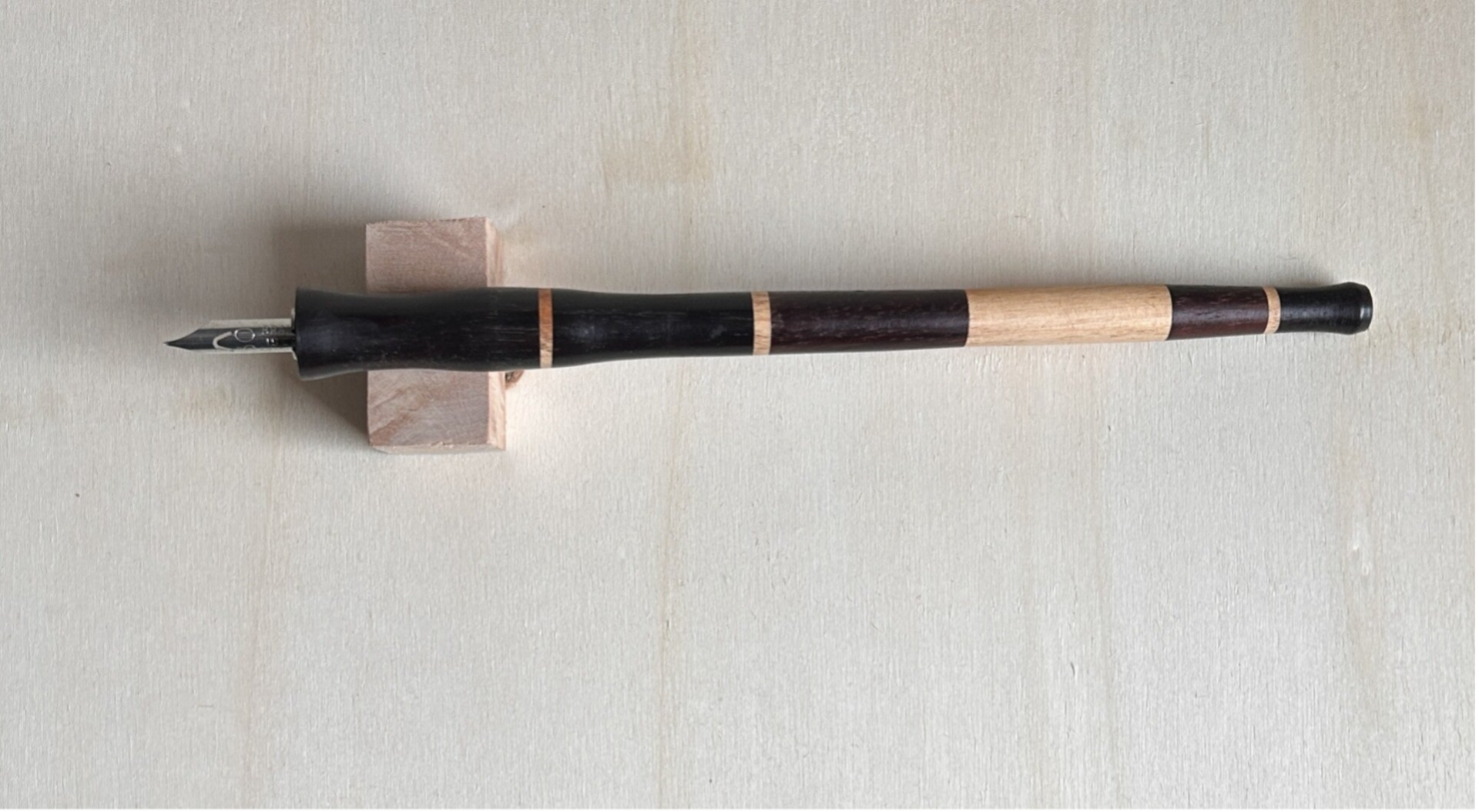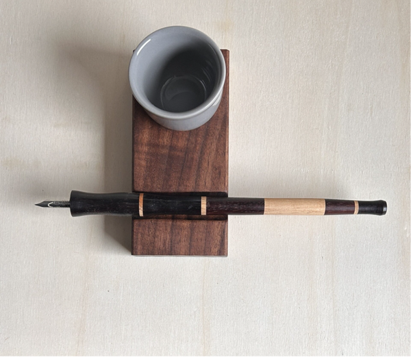 Handgefertigter Kalligrafie‑Stifthalter‑Set aus Stechpalme / Palisander/ Eibe – inklusive Stiftablage & Keramik‑Tintenbehälter